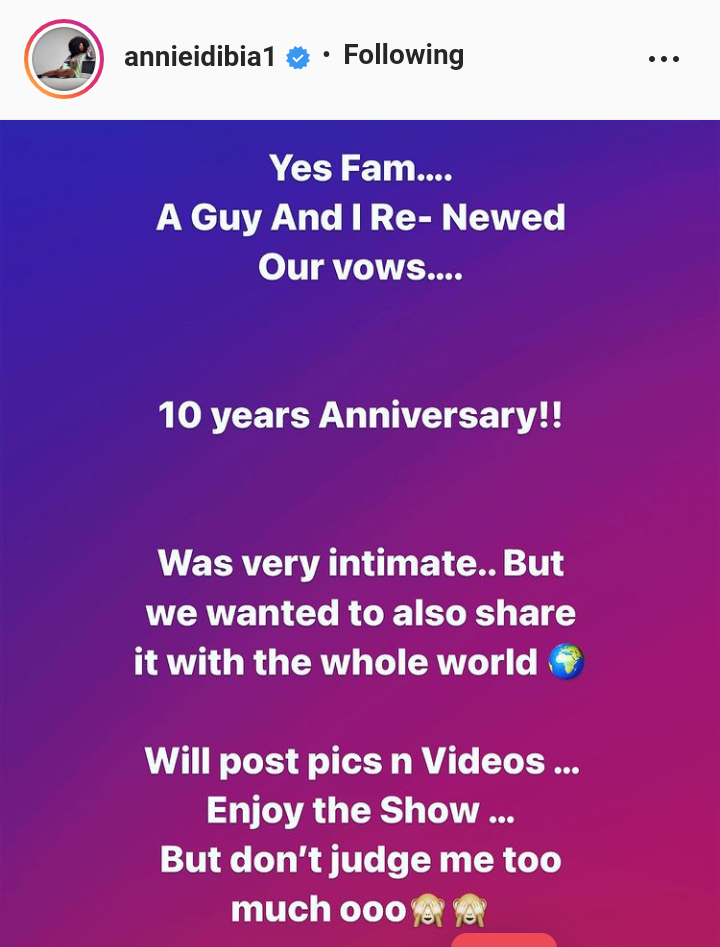 “Yes, Fam…A Guy And I Re- Newed Our Vows…10 years Anniversary!! Was very intimate. But we wanted to also share it with the whole world. Will post pics n Videos,” she wrote.