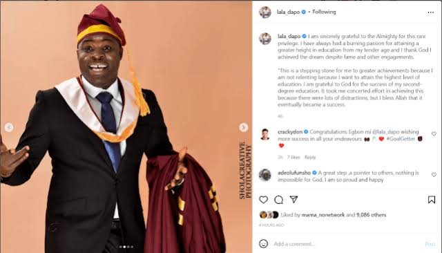 Actor, Muyideen Oladapo “Lala” bags Master’s Degree from LASU