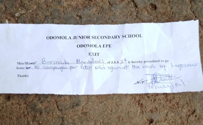 A viral Facebook post by the father, which had a screenshot of the exit slip, read, “This is to inform you all that my daughter, Marvelous Barinada, was exit (sic) from Odomola Secondary School today, March 14, 2023, by the school principal, just because my daughter uses Peter Obi’s poster paper to wrap her school notebooks, and this girl is just 10 years old; she doesn’t know anything about politics, but she was sent away from school without informing the parent because they said we supported Peter Obi and the Labour Party.