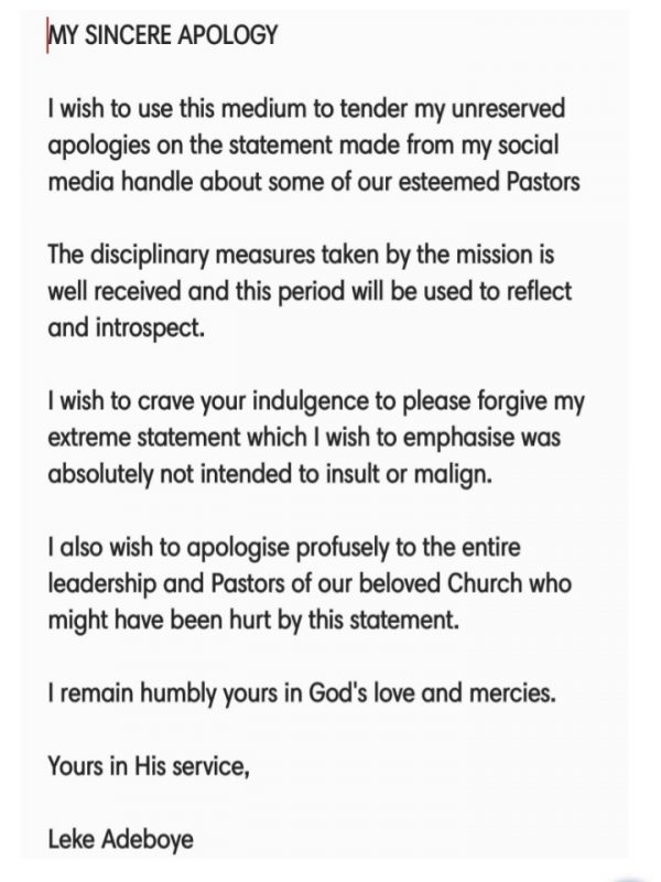 Pastor Leke Adeboye, after facing a three-man disciplinary panel tendered an unreserved apology, saying he did not intends to bring disrepute to servants of God.