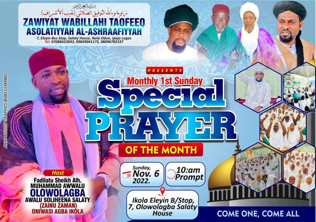 Zawiyat Wabillahi Taofeeq Asoltiyah Al-Ashraafiyah Islamic organization, Ipaja Lagos is inviting members of the Muslim Umah to it monthly first Sunday Special Prayer, the November 2022, Edition.