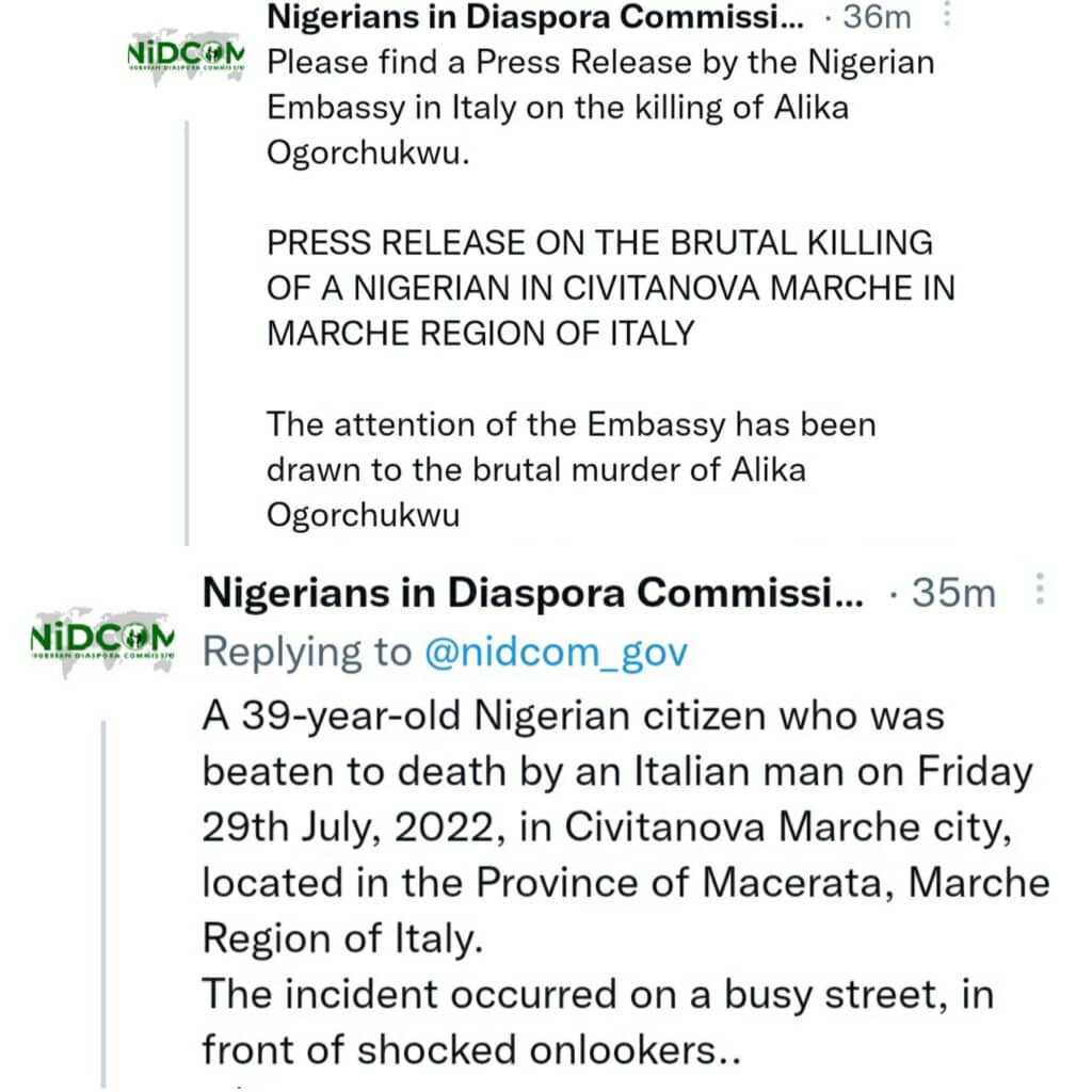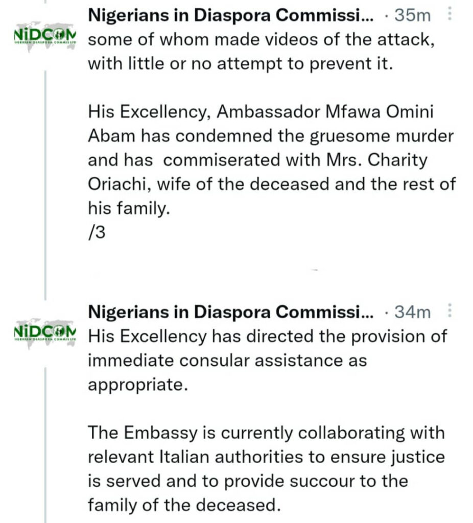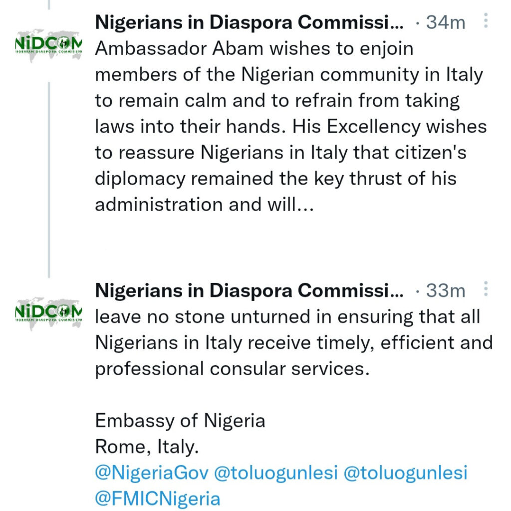 The statement adds that the Nigerian Ambassador to Italy, Mfawa Omini Abam, has condemned the killing.
