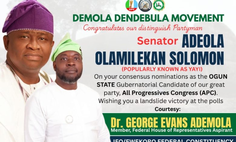 The political landscape in Ogun State’s ruling All Progressives Congress (APC) appears to be gathering momentum ahead of the 2027 governorship race, as the Demola Dendebula Movement (DDM) has publicly congratulated Senator Adeola Olamilekan Solomon, popularly known as Yayi, over what it described as his consensus emergence as the party’s gubernatorial candidate.