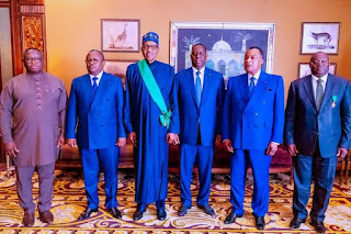 Award 5: President Buhari with L-R: President of Sierra Leone Julius Bio, President of Guinea Bissau Umaro Sissoco Embalo, President of Senegal Macky Sall, President of Congo Denis Sassou-Nguesso and Vice President of Cote D’Ivoire Tiémoko Meyliet Koné as he received the Highest National Honour of the Republic of Senegal “L’ Ordre National De Lion Senegal” in Dakar on 7th July 2022