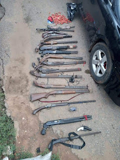 After a thorough search, the troops recovered ten Pump Action Shotguns, seven locally fabricated guns, one locally made Revolver Pistol, eighty Live Cartridges, one Baofeng Radio and substance suspected to be gun powder.Others include Satchet of Improvised Explosive Device (IED) and a Toyota Camry Saloon car.